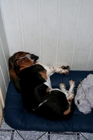 Chcieliśmy przypomnieć się z Bossem, który mężnieje z miesiąca na miesiąc, co zresztą widać na załączonym zdjęciu,na którym udało się mi go uchwycić w nietypowej pozycji podczas wieczornej sjesty:)